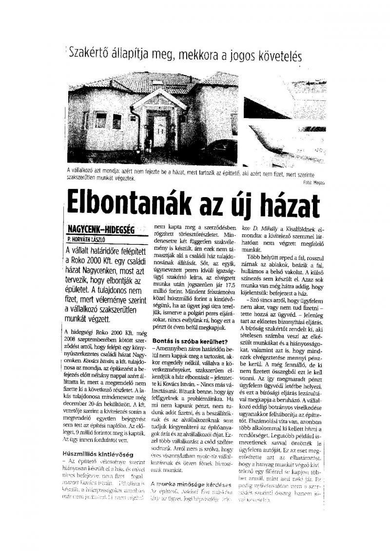 A vállalt határidőre felépített a Rokko 2000 Kft egy családi házat Nagycenken, most mégis azt tervezik, hogy elbontják az épületet. A tulajdonos nem fizet, mert véleménye szerint a vállakozó szakszerűtlen munkát végzett.